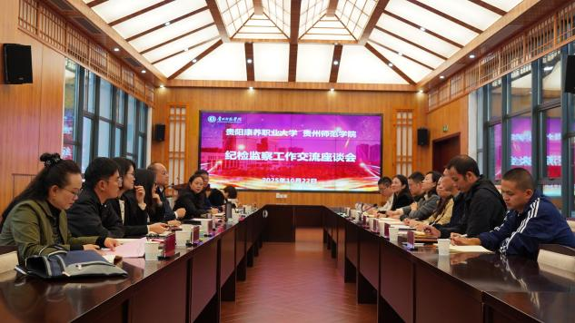 会前,杨璇陪同贵阳康养职业大学纪委一行参观了学校党员教育基地与贵州教育史馆,通过实地讲解、实物展示、沉浸式体验等方式,详细了解了学校在党建文化、教育历史传承及廉政教育融合等方面的实践成果,为后续交流会议奠定了良好基础。